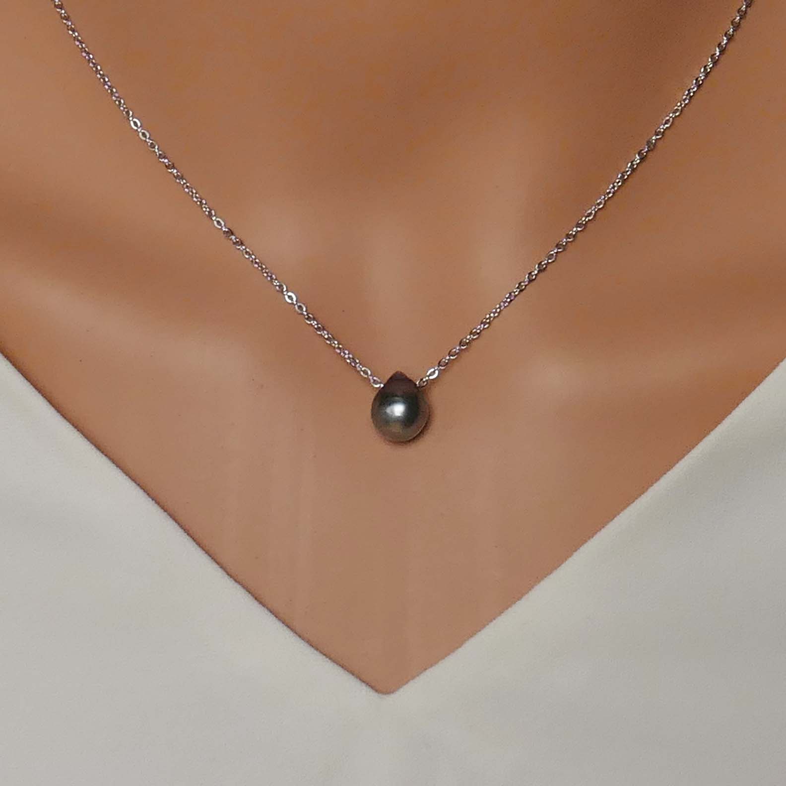 Zierliche Halskette aus Edelstahl mit einer tropfenförmigen Tahitiperle, die eine leicht barocke Form hat.