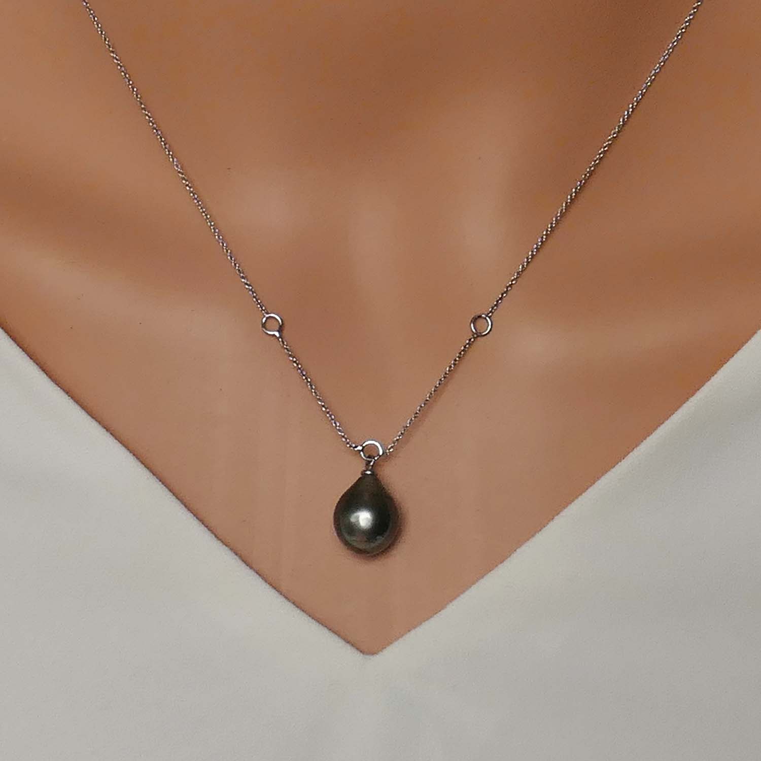Zierliche Halskette mit einer tropfenförmigen Tahitiperle, die einen perfekten Lüster hat.
