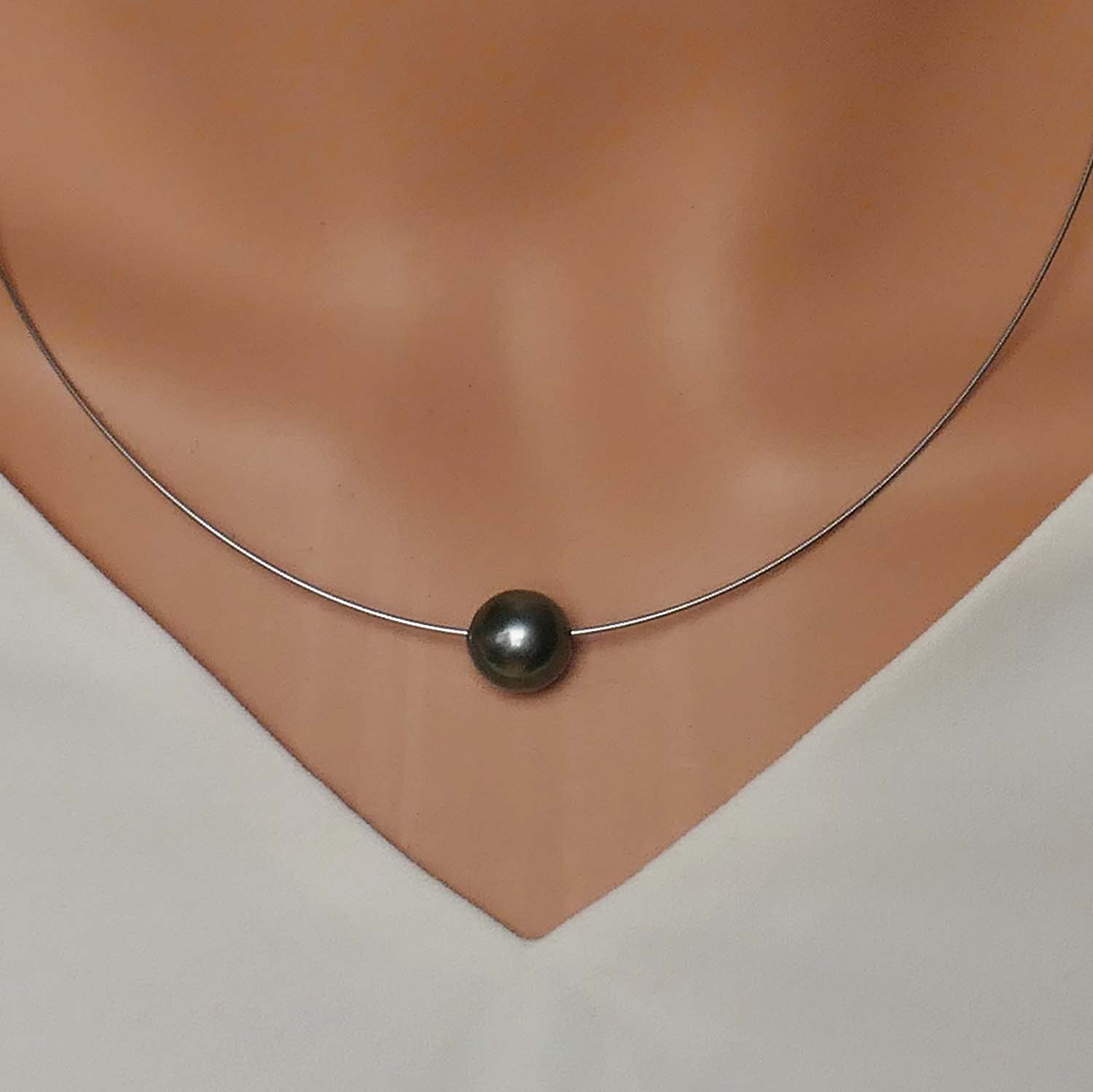Puristischer Halsreif aus Edelstahl mit hochwertiger Tahitiperle aus der Südsee.