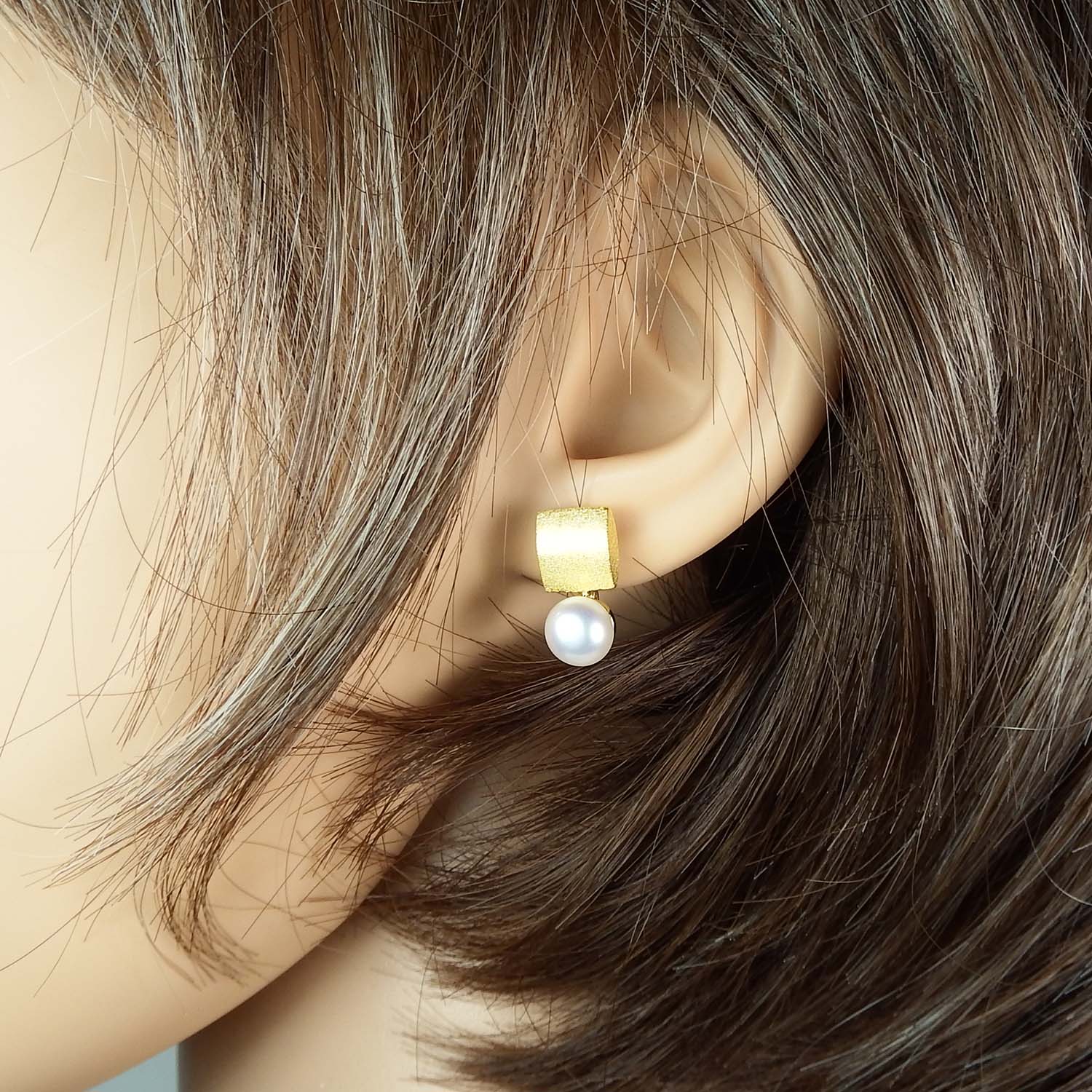 Perlohrstecker, ganz modern gestaltet. Die Ohrstecker Menuett von Bernd Wolf aus vergoldetem Sterlingsilber mit Süßwasserperlen sind 14 mm lang.