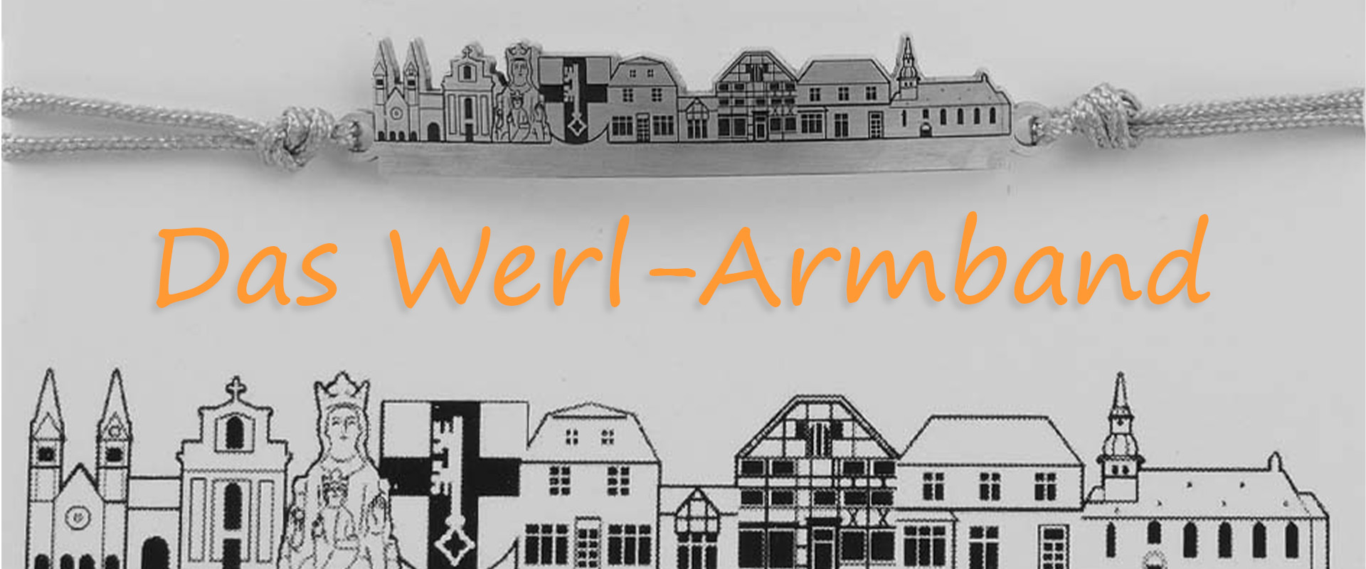 Das Werl-Armband zeigt das Stadtwappen und fünf Sehenswürdigkeiten der Wallfahrtstadt Werl: die Marienfigur, Basilika, Propsteikirche, Saline, Krämergasse.