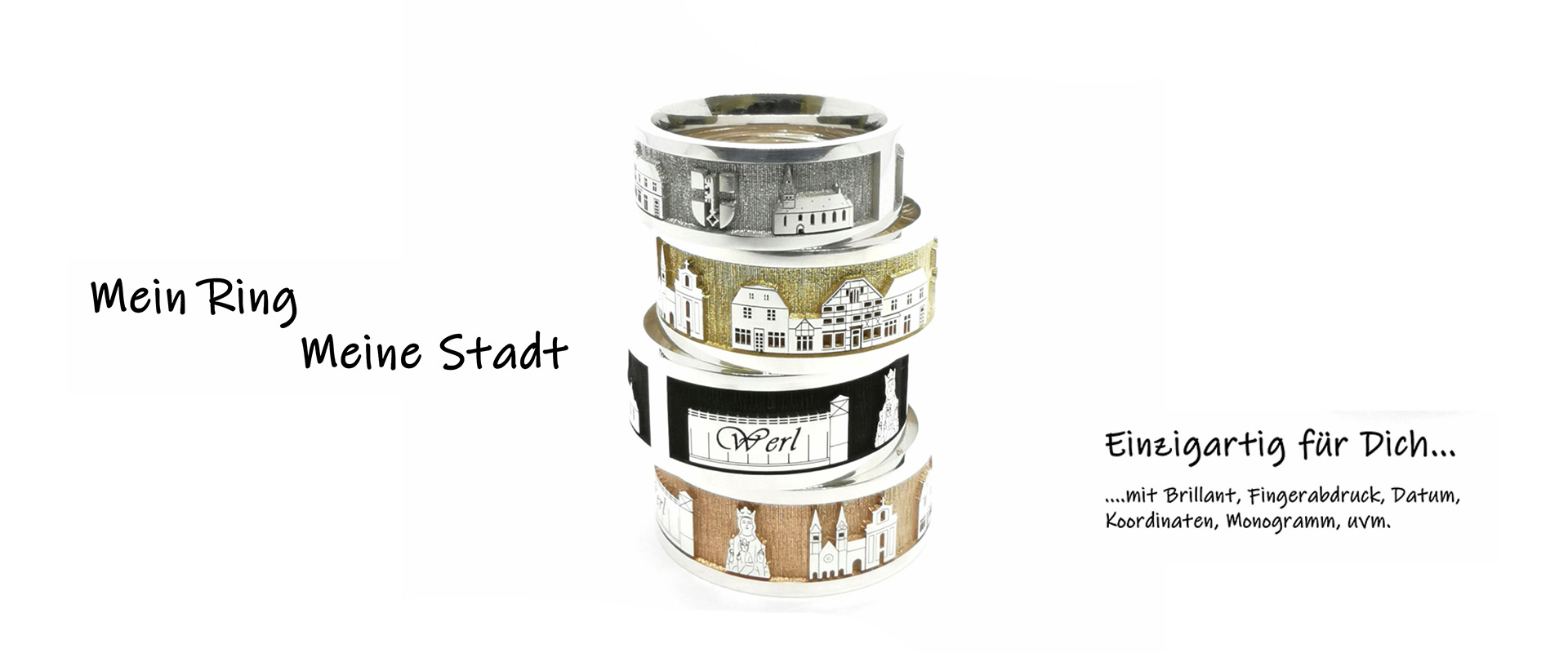 Der Werl-Ring zeigt das Stadtwappen und fünf Sehenswürdigkeiten der Wallfahrtstadt Werl: die Marienfigur, Basilika, Propsteikirche, Saline, Krämergasse. Alle Elemente sind halbplastisch dargestellt und erzeugen so eine faszinierende Optik. Durch die Innenwölbung lässt sich der massive Silberring sehr angenehm tragen. Das Besondere an diesem schönen Ring ist: Sie können ein bis zwei individuelle Sonderzeichen (je nach Ringgröße) gegen Aufpreis einfügen lassen: Ringsymbole mit Ihren Daten (+ 59 €) QR-Code oder Ihr persönliches Monogramm (+ 69 €) Brillant (0,03 ct., tw/si) (+ 139 €) ein persönliches Datum, eingerahmt (+ 45 €) die Koordinaten Ihres Lieblingsortes (+ 36 €) Ihren Fingerabdruck (+ 65 €) ein Haus oder Gebäude (ab 145 €) Natürlich lassen sich auch Sonderwünsche einfügen wie ein Scherenschnitt, das Familienwappen, Ihr Haustier, Auto, Motorrad, Hobby ... Ihrer Fantasie sind keine Grenzen gesetzt.