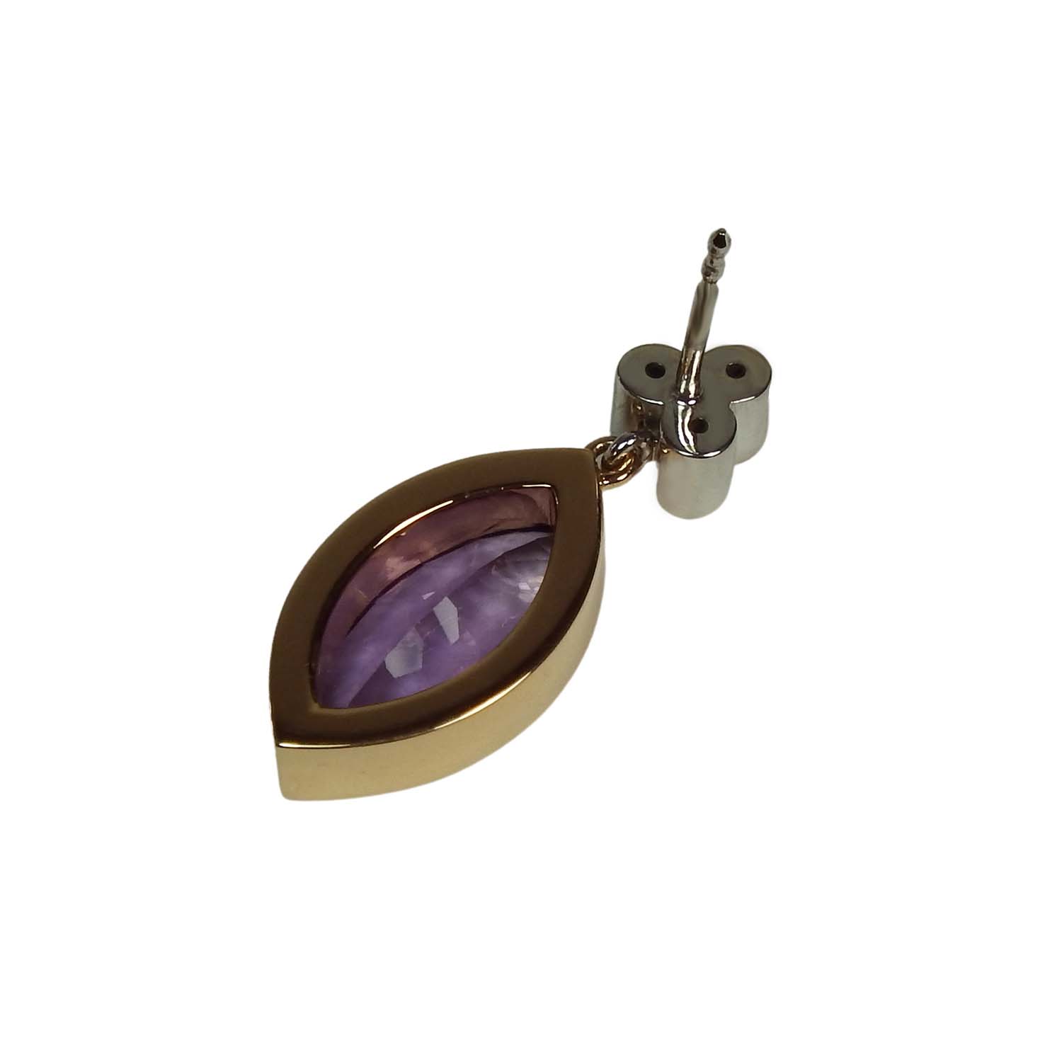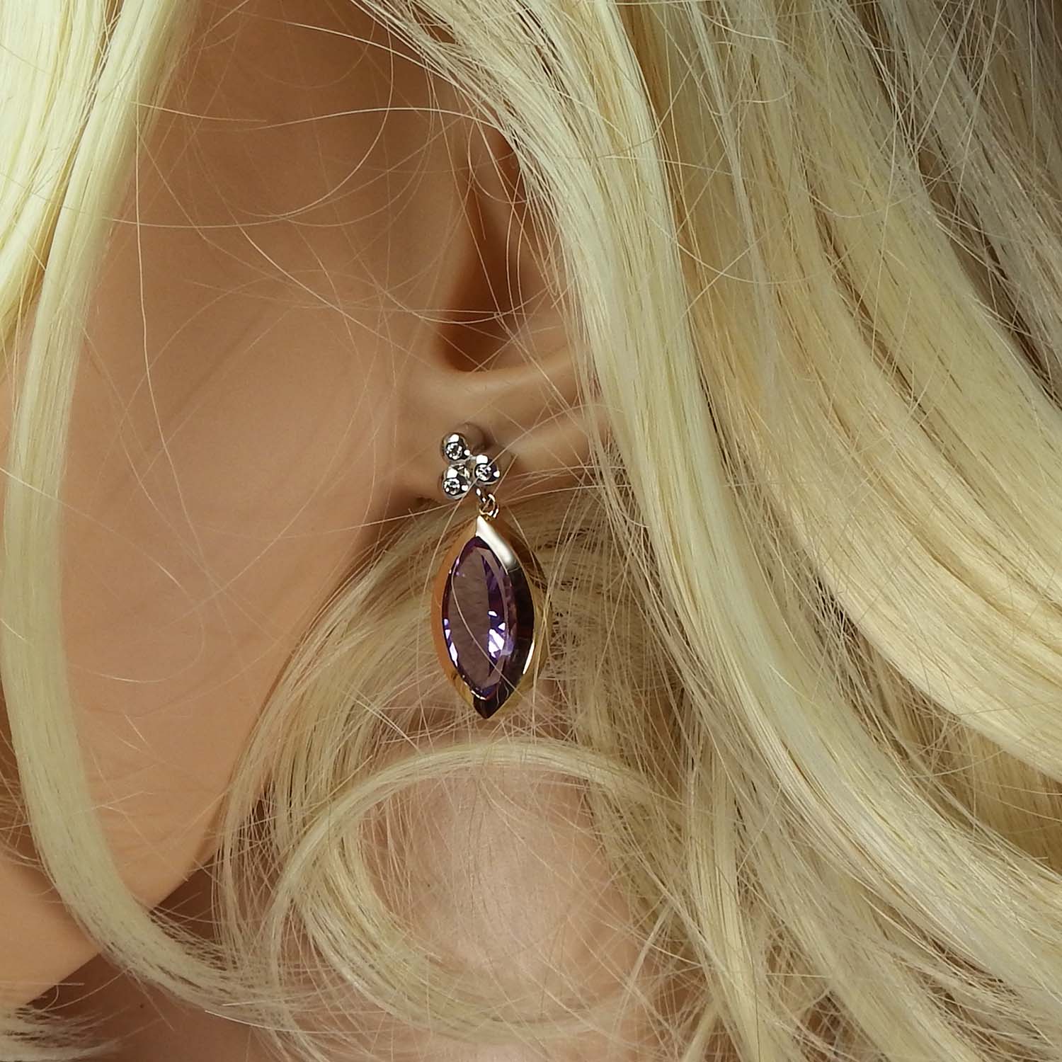 750er Roségold und Weißgold bilden einen extravaganten Kontrast zu dem Lila der navetteförmig geschliffenen Amethyste.
