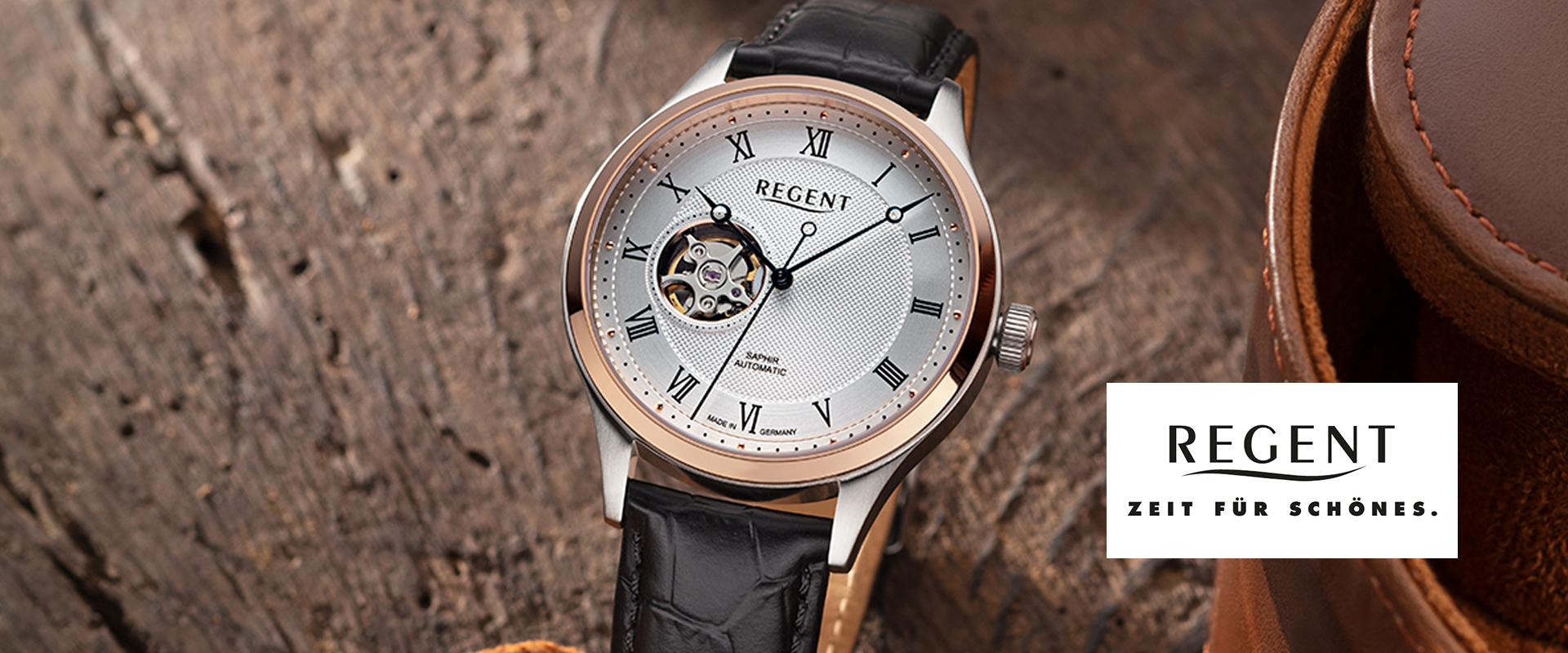 Die Regent-Herrenuhr mit dem interessant strukturierten Zifferblatt hat ein Automatikwerk.Durch den Glasboden ist das Werk Miyota 8215 sichtbar.Das Gehäuse ist ionen-goldplattiert.