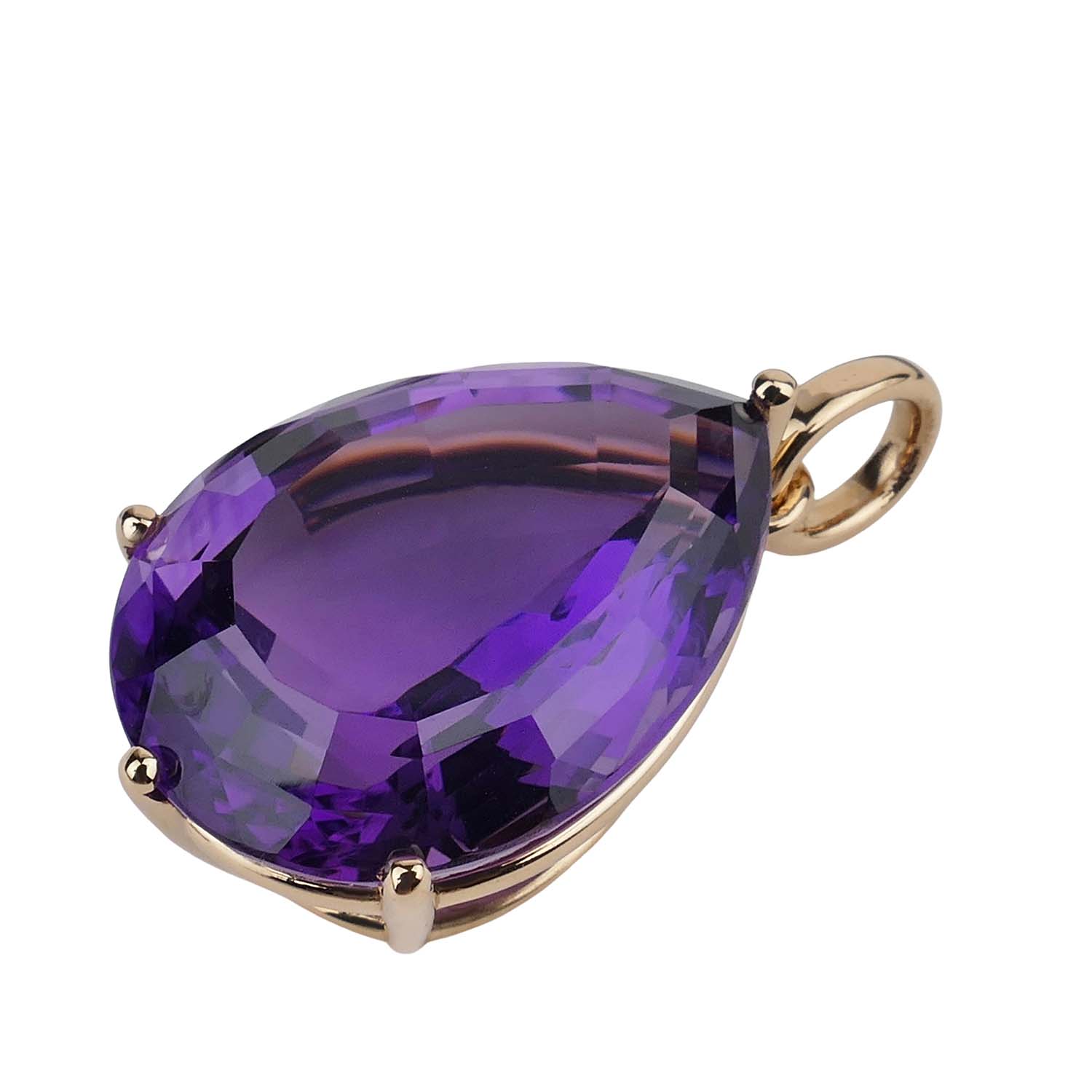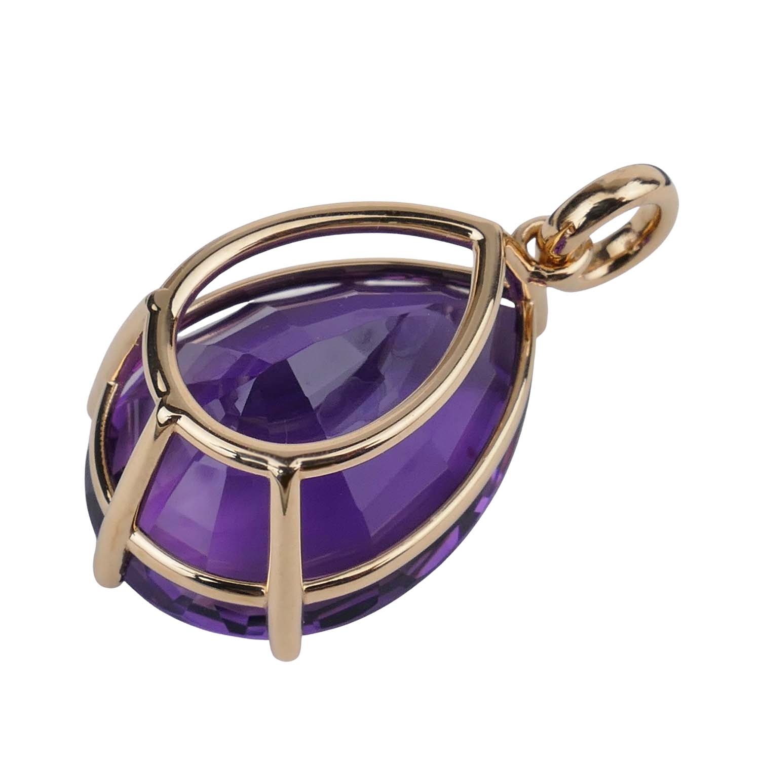 Der facettierte Amethyst im Birnkernschliff wird von einer filigranen Fassung aus Roségold 750/000 mit vier Krappen so gehalten, dass der Stein perfekt in Szene gesetzt wird.