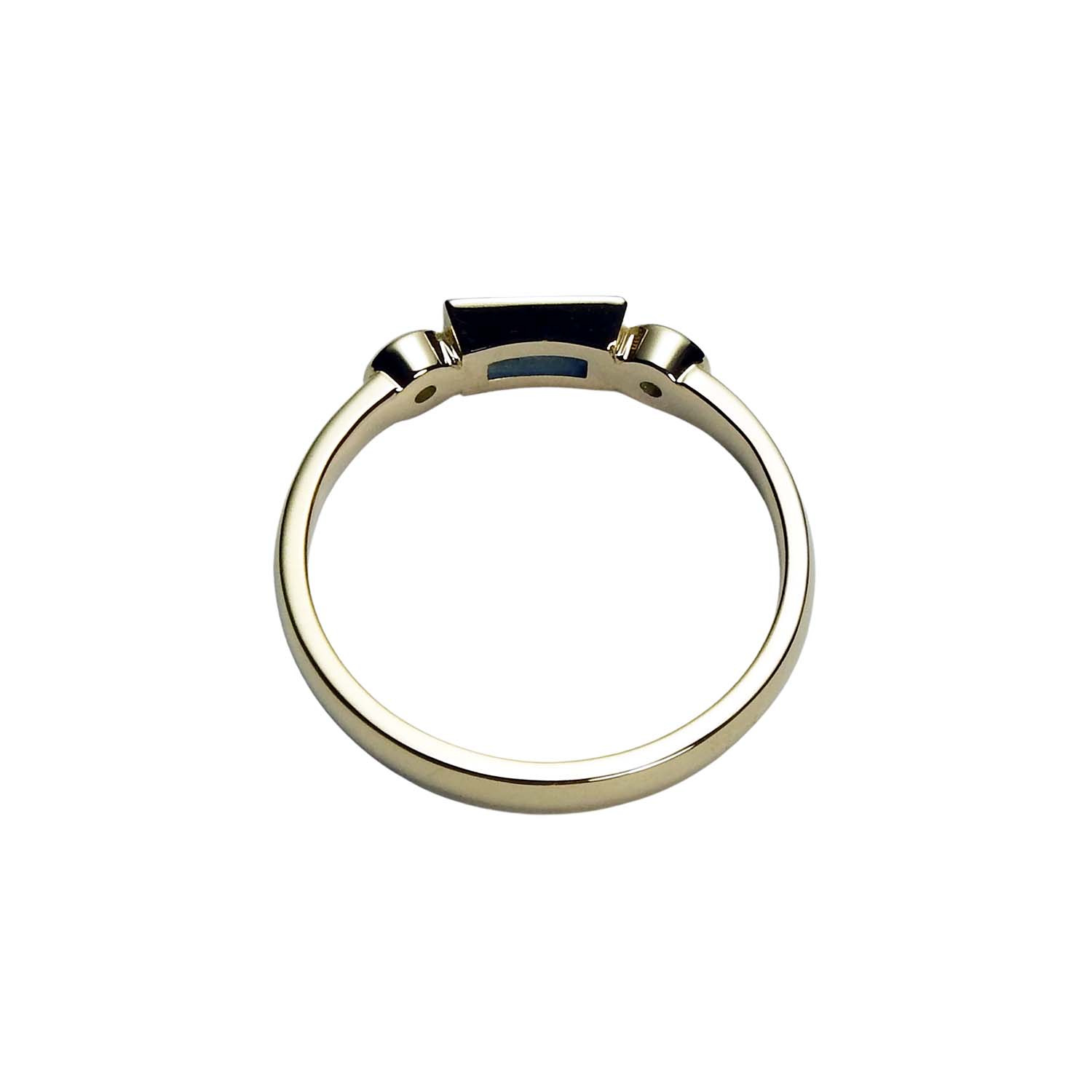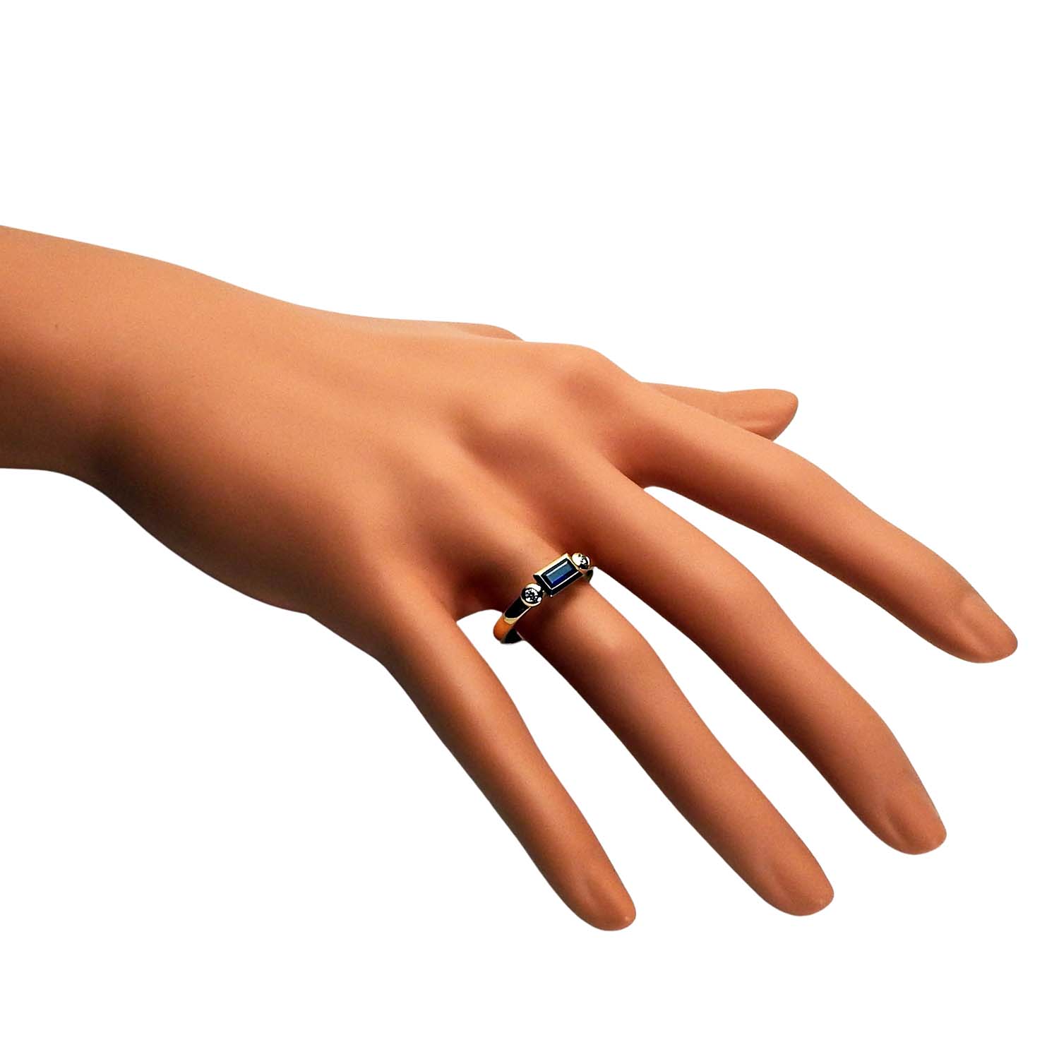Der baguetteförmig geschliffene Safir (0,44 ct.) wird von zwei hochwertigen Brillanten (zus. 0,08 ct., tw/vvs) eingerahmt.