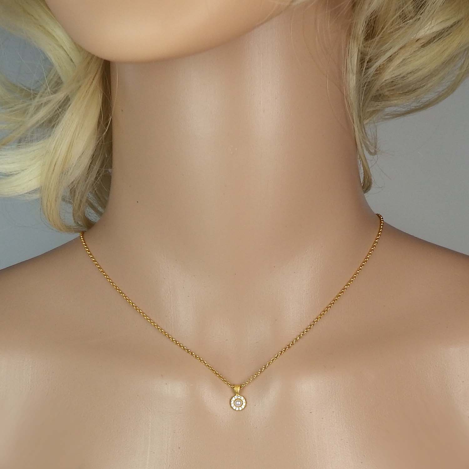 Der Anhänger der Halskette Arenia von Bernd Wolf kommt klassisch schön daher - mit einer hochwertigen Süßwasserperle, umgeben von strahlenden Zirkonia
