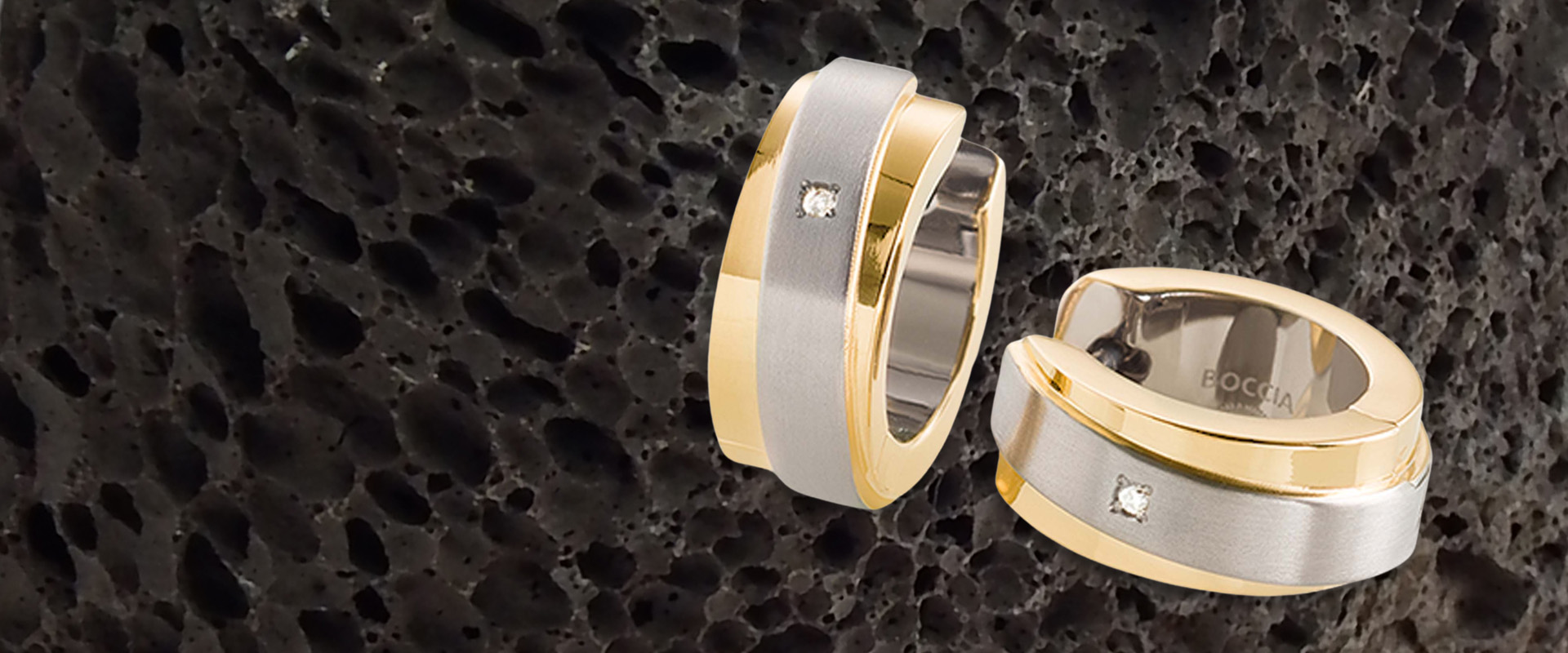 Stylische Creolen von Boccia aus nickelfreiem Reintitan, die sich besonders für Menschen mit Nickelallergien eignen. Durch ihre Zweifarbigkeit lassen sich die Ohrringe vielseitig tragen, denn sie passen zu silberfarbenen und goldfarbenen Edelmetallen. Die beiden Brillanten(zus. 0,01 ct., w/si) sind raffiniert in Kanalfassungen gefasst. Das Maß der Ohrringe ist 7x15 mm.